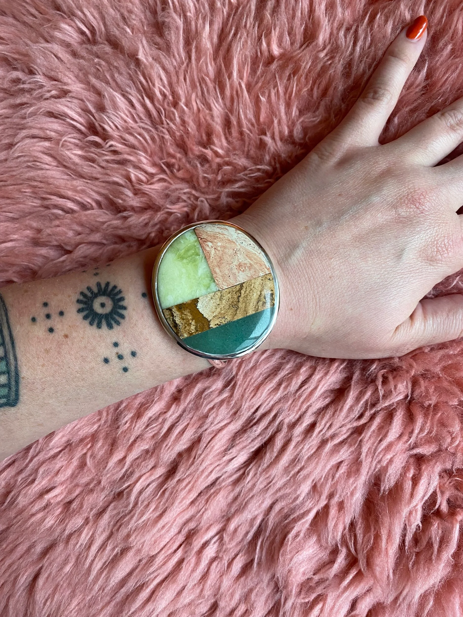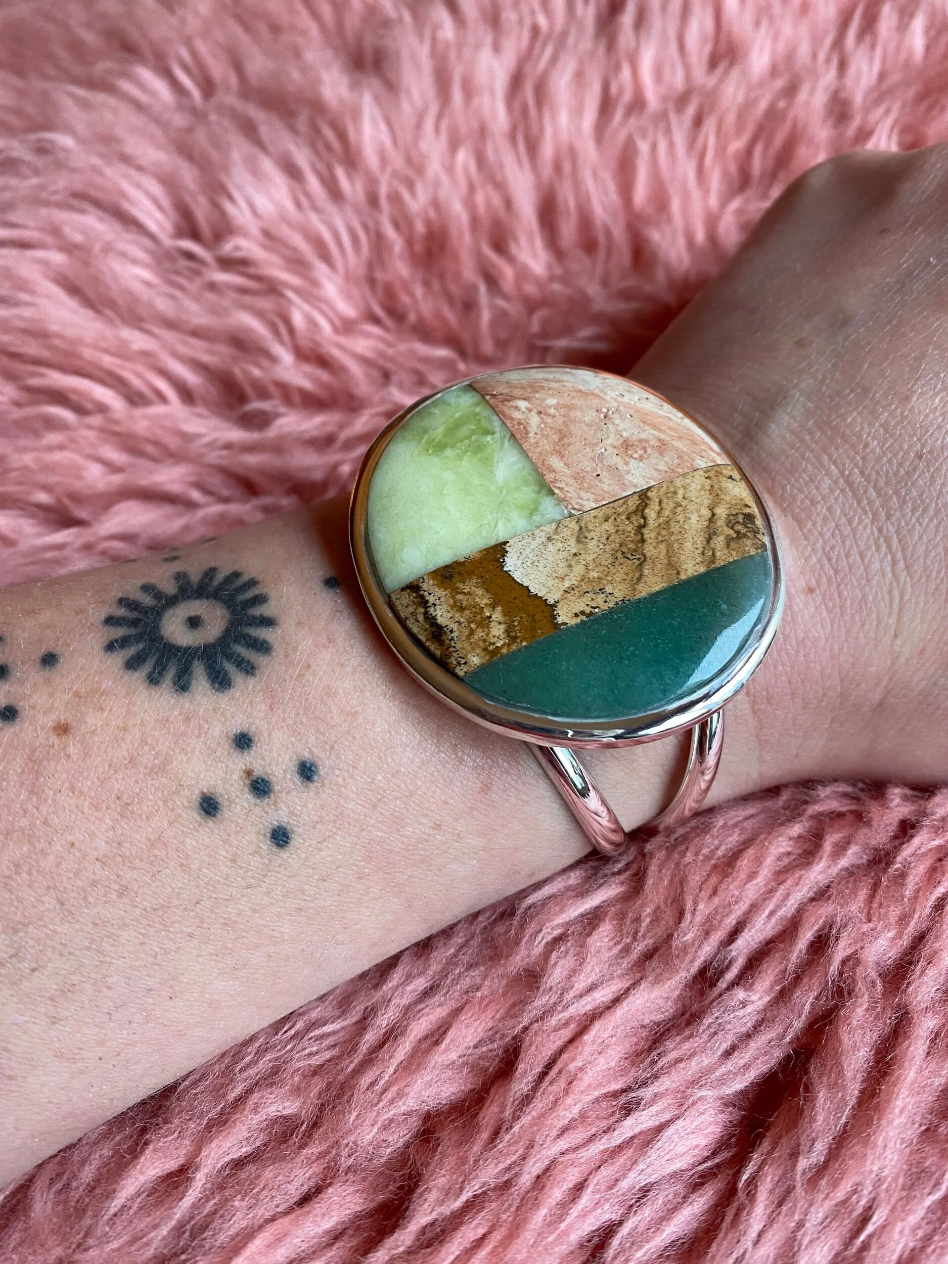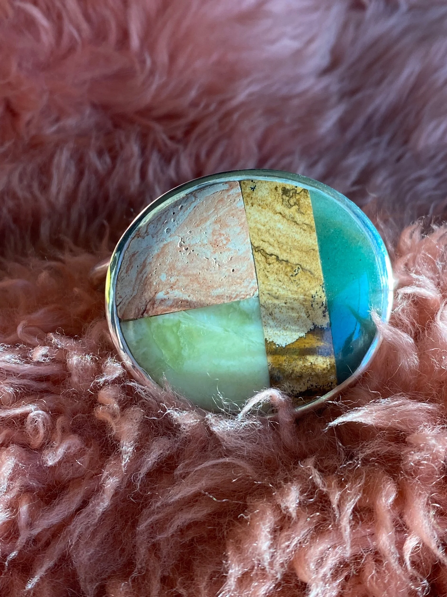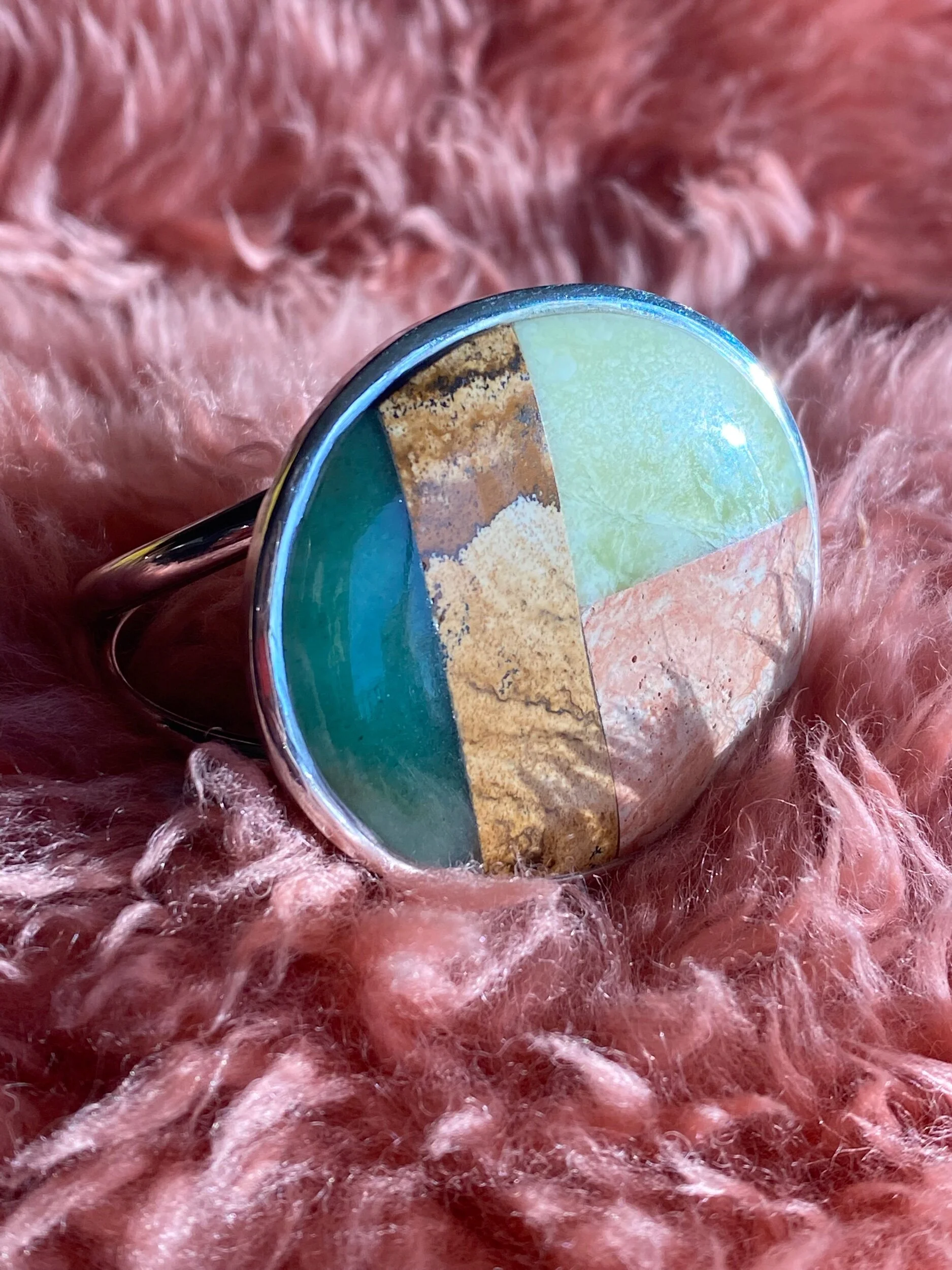 hand crafted sterling silver jewelry with an emphasis on vibrant stones Categories: All Rings Pendants Earrings Shop All | Rings | Pendants | Earrings | Quick View Sunrise ☀️ Inlay Ring, Size 7-3/4 $600.00 Limited Availability Quick View Sunrise ☀️ Inlay Ring, Size 6 $600.00 Limited Availability Quick View Sunrise ☀️ Inlay Ring, Size 7-3/4 $600.00 Limited Availability Quick View Sunrise ☀️ Inlay Ring, Size 9-1/4 $600.00 Limited Availability Quick View Sunrise 🌅 Inlay Necklace, Half Round $550.00 Limited Availability Quick View Sunrise 🌅 Inlay Necklace $600.00 Sold out Quick View Sunrise 🌅 Inlay Necklace $600.00 Limited Availability Quick View Sunrise 🌅 Inlay Necklace, Half Round $550.00 Limited Availability Quick View Sunrise 🌅 Inlay Necklace $600.00 Sold out Quick View Juicy Tourmaline, Turquoise, and Orville Jack Lariat $285.00 Limited Availability Quick View Stunning Turquoise, Opal, Tourmaline Ring - Size 8 $285.00 Limited Availability Quick View Full Moon 🌕 Inlay Cuff $850.00 Limited Availability Quick View Peacock 🦚 Ring, Size 9.25, Ready to Ship $225.00 Limited Availability Quick View Gift Card from $25.00